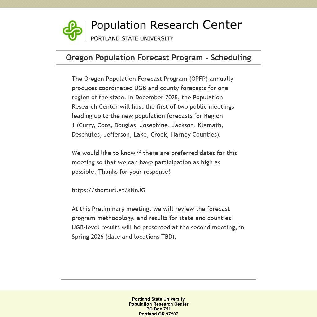 The Oregon Population Forecast Program (OPFP) annually produces coordinated UGB and county forecasts for one region of the state. In December 2025, the Population Research Center will host the first of two public meetings leading up to the new population forecasts for Region 1 (Curry, Coos, Douglas, Josephine, Jackson, Klamath, Deschutes, Jefferson, Lake, Crook, Harney Counties).