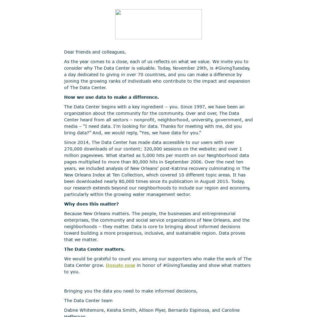 As the year comes to a close, each of us reflects on what we value. We invite you to consider why The Data Center is valuable. Today, November 29th, is #GivingTuesday, a day dedicated to giving in over 70 countries, and you can make a difference by joining the growing ranks of individuals who contribute to the impact and expansion of The Data Center.