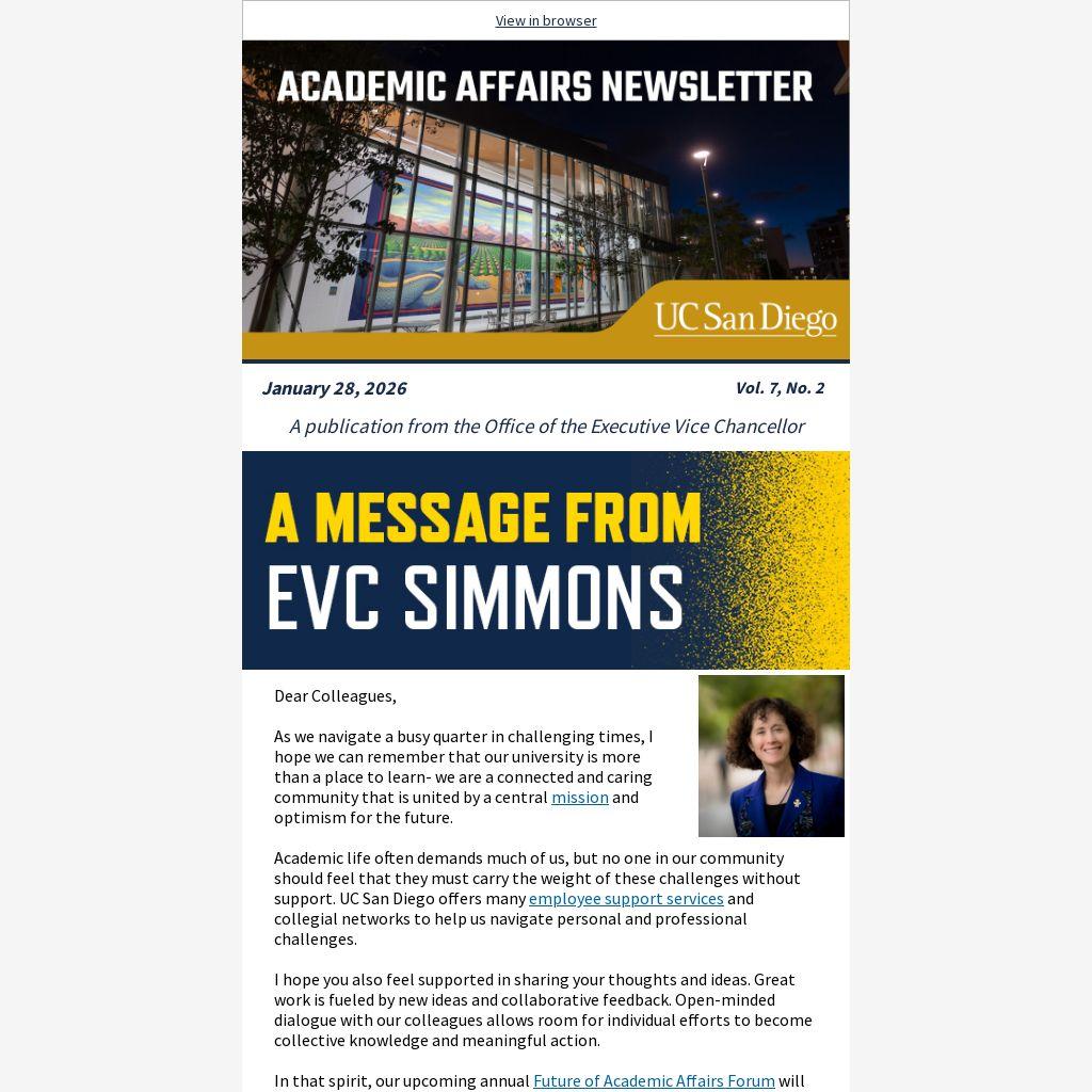 In that spirit, our upcoming annual Future of Academic Affairs Forum will be an opportunity to learn about collaborative work being done in Academic Affairs and to contribute your input on how to take it in new and fruitful directions. View the FOAA agenda and please join us on Jan. 29th.