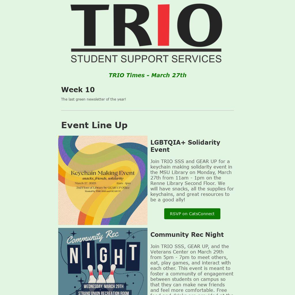Join TRIO SSS and GEAR UP for a keychain making solidarity event in the MSU Library on Monday, March 27th from 11am - 1pm on the Renne Library Second Floor. We will have snacks, all the supplies for keychains, and great resources to be a good ally!