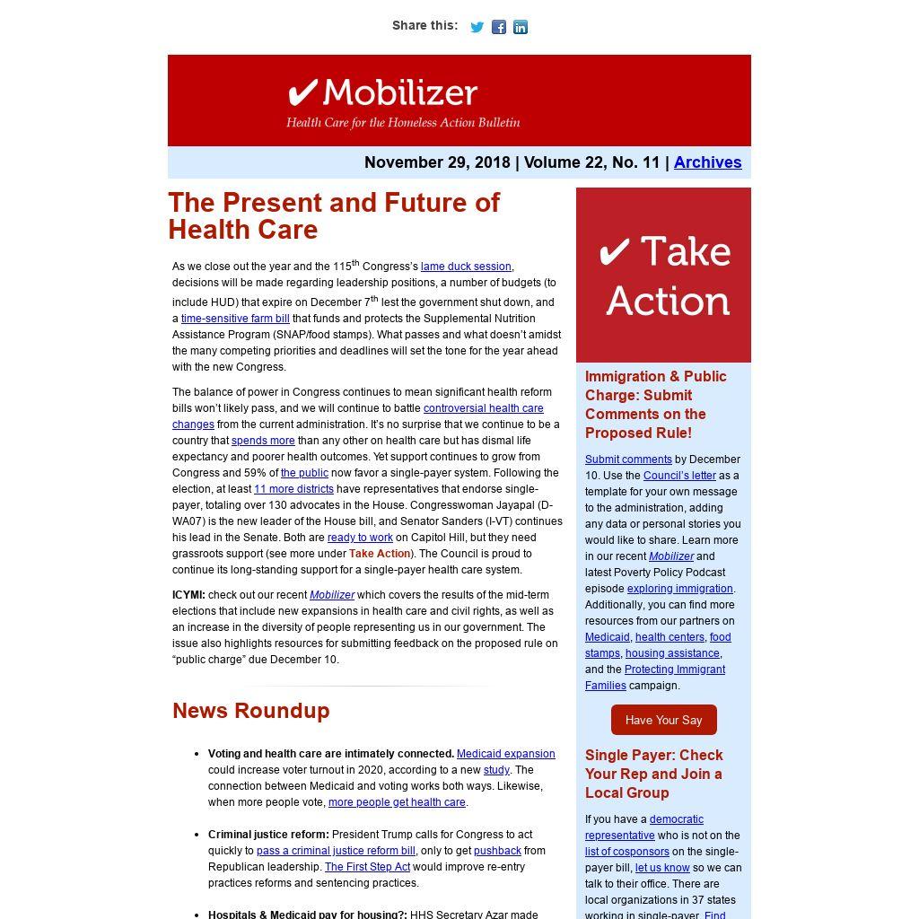 Mobilizer which covers the results of the mid-term elections that include new expansions in health care and civil rights, as well as an increase in the diversity of people representing us in our government. The issue also highlights resources for submitting feedback on the proposed rule on “public charge” due December 10.