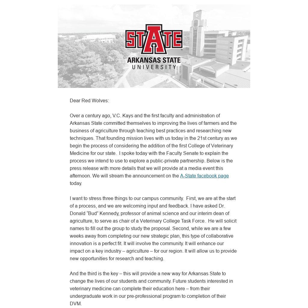 Over a century ago, V.C. Kays and the first faculty and administration of Arkansas State committed themselves to improving the lives of farmers and the business of agriculture through teaching best practices and researching new techniques. That founding mission lives with us today in the 21st century as we begin the process of considering the addition of the first College of Veterinary Medicine for our state. I spoke today with the Faculty Senate to explain the process we intend to use to explore a public-private partnership. Below is the press release with more details that we will provide at a media event this afternoon. We will stream the announcement on the A-State facebook page today.