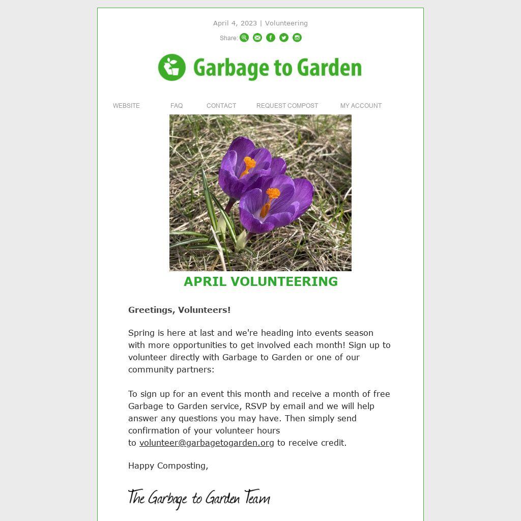 Spring is here at last and we're heading into events season with more opportunities to get involved each month! Sign up to volunteer directly with Garbage to Garden or one of our community partners: