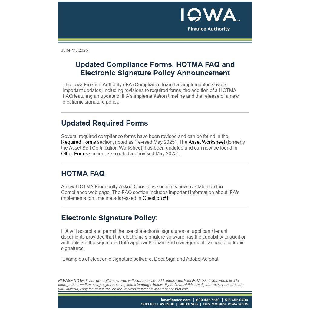 The Iowa Finance Authority (IFA) Compliance team has implemented several important updates, including revisions to required forms, the addition of a HOTMA FAQ featuring an update of IFA's implementation timeline and the release of a new electronic signature policy.