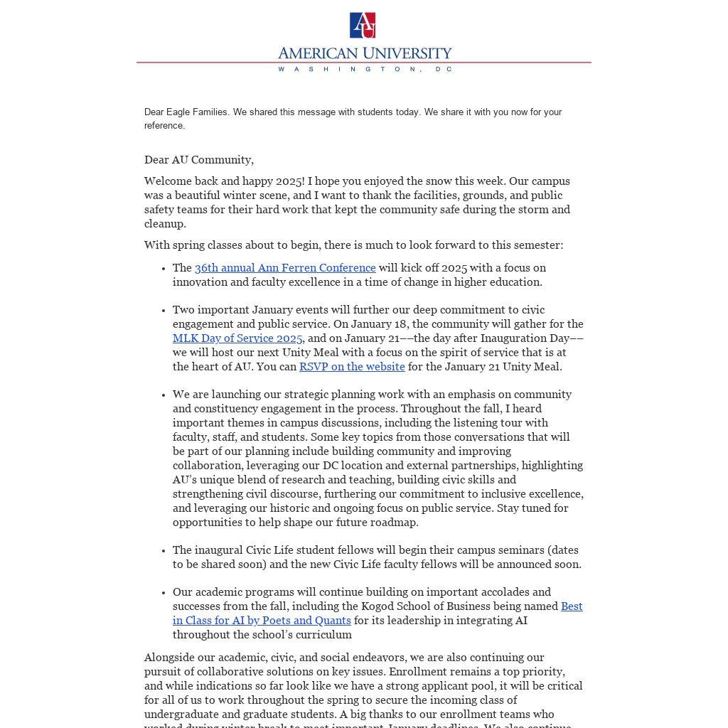 As we look ahead, this semester is filled with opportunities. I am excited about our possibilities, and I hope you are as well. Thank you for all you do for American University. Good luck with all your pursuits, and go Eagles!