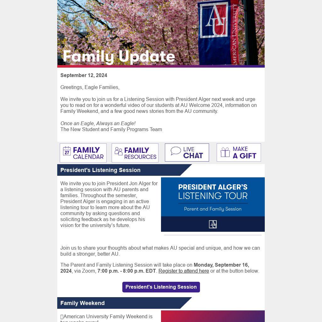 We invite you to join us for a Listening Session with President Alger next week and urge you to read on for a wonderful video of our students at AU Welcome 2024, information on Family Weekend, and a few good news stories from the AU community.