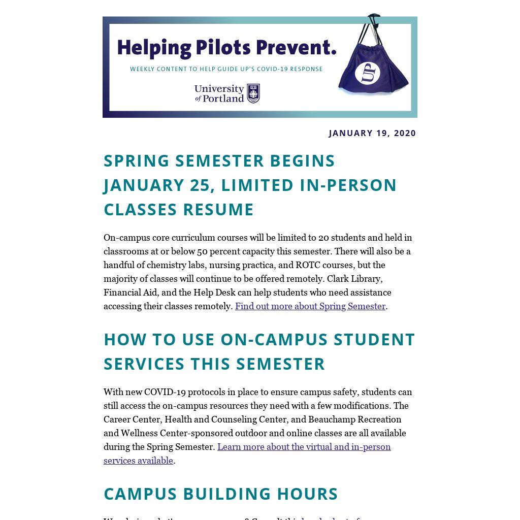 The Pilots Prevent Dashboard tracks all COVID-19 tests conducted on campus. For the week ending January 17, the University of Portland conducted 418 tests. There are currently 4 new positive cases with 28 students in quarantine and 6 students in isolation. See the full dashboard.