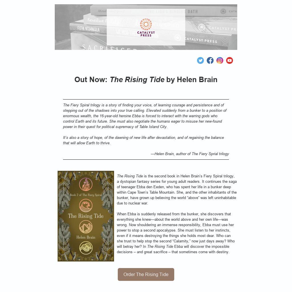 The Rising Tide is the second book in Helen Brain’s Fiery Spiral trilogy, a dystopian fantasy series for young adult readers. It continues the saga of teenager Ebba den Eeden, who has spent her life in a bunker deep within Cape Town’s Table Mountain. She, and the other inhabitants of the bunker, have grown up believing the world “above” was left uninhabitable due to nuclear war.