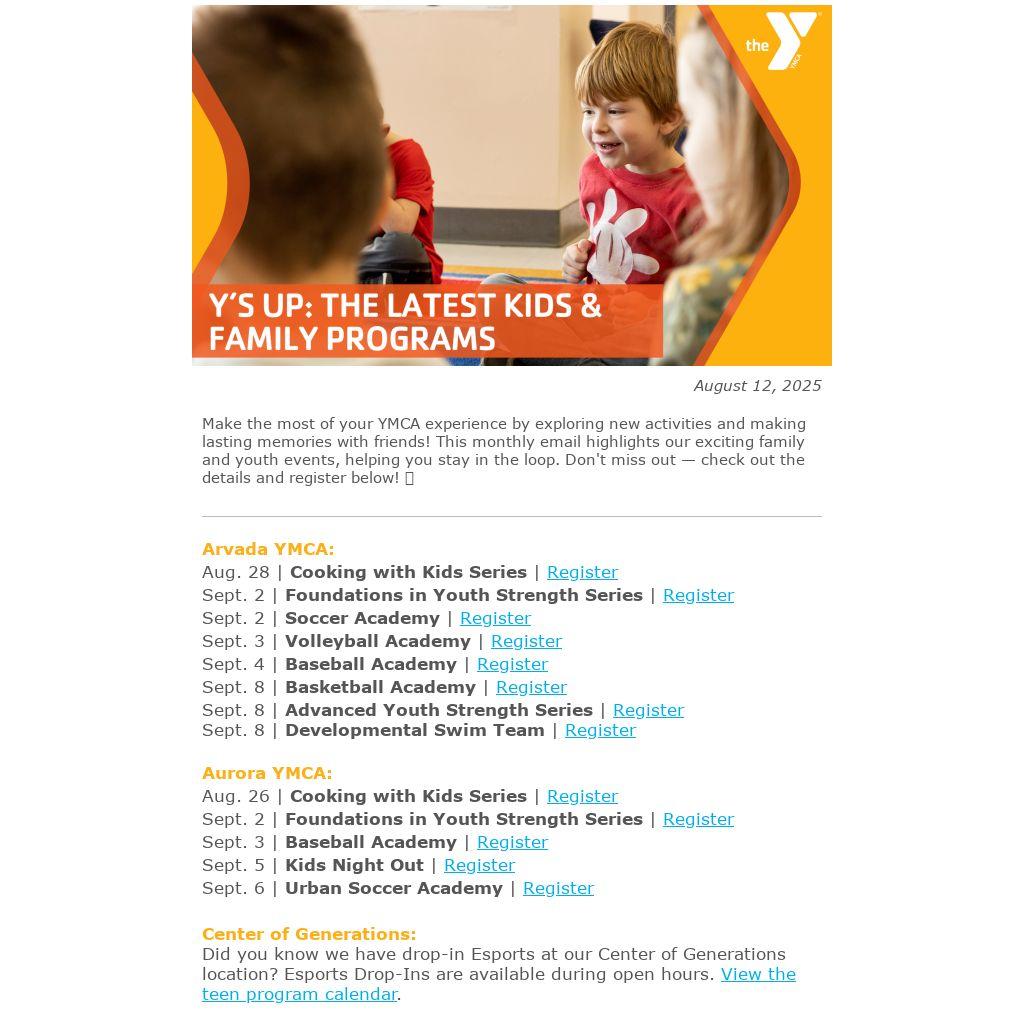 Make the most of your YMCA experience by exploring new activities and making lasting memories with friends! This monthly email highlights our exciting family and youth events, helping you stay in the loop. Don't miss out โ check out the details and register below! ๐