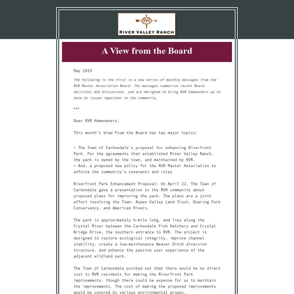This month’s View From the Board has two major topics: • The Town of Carbondale’s proposal for enhancing Riverfront Park. Per the agreements that established River Valley Ranch, the park is owned by the town, and maintained by RVR.