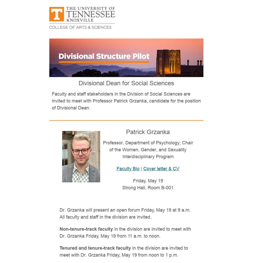 Non-tenure-track faculty in the division are invited to meet with Dr. Grzanka Friday, May 19 from 11 a.m. to noon.