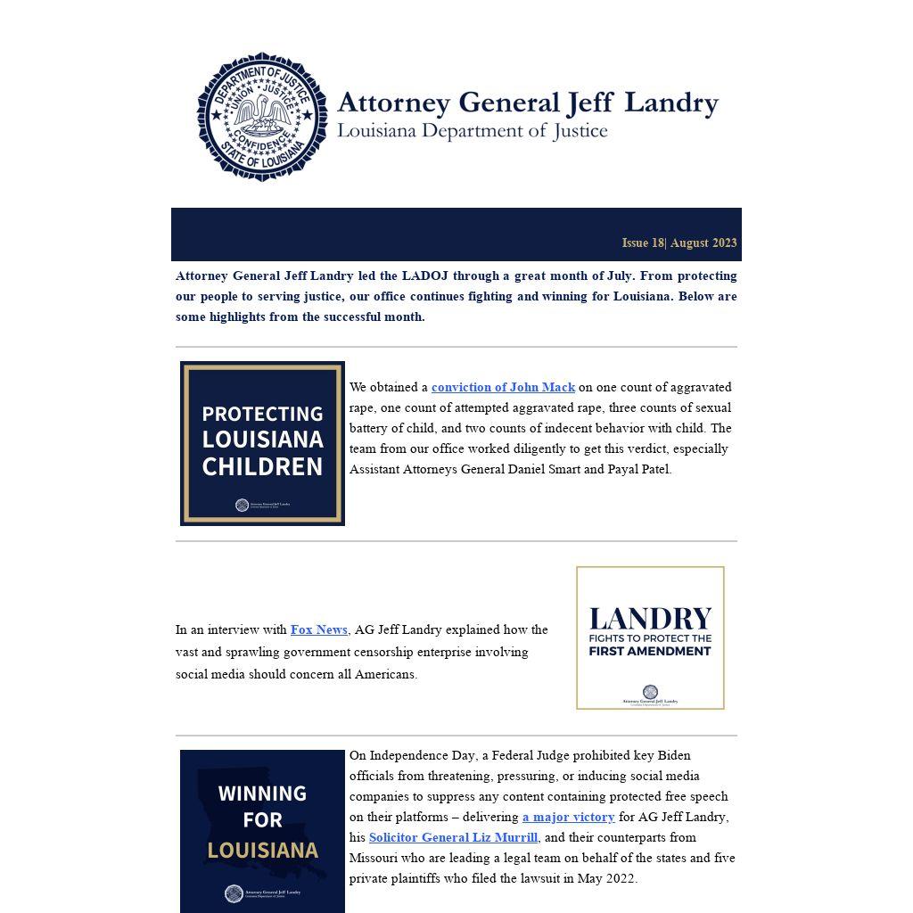 Attorney General Jeff Landry led the LADOJ through a great month of July. From protecting our people to serving justice, our office continues fighting and winning for Louisiana. Below are some highlights from the successful month.