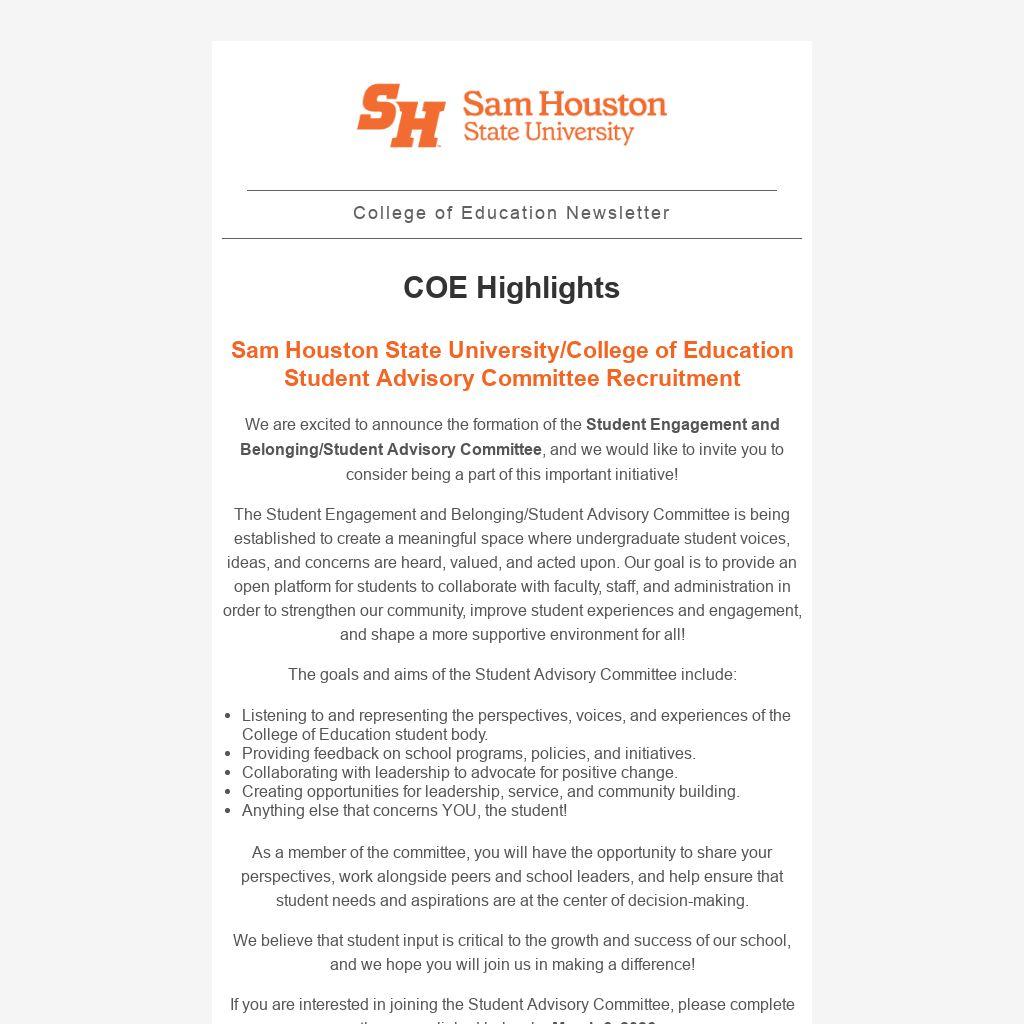 We are excited to announce the formation of the Student Engagement and Belonging/Student Advisory Committee, and we would like to invite you to consider being a part of this important initiative!