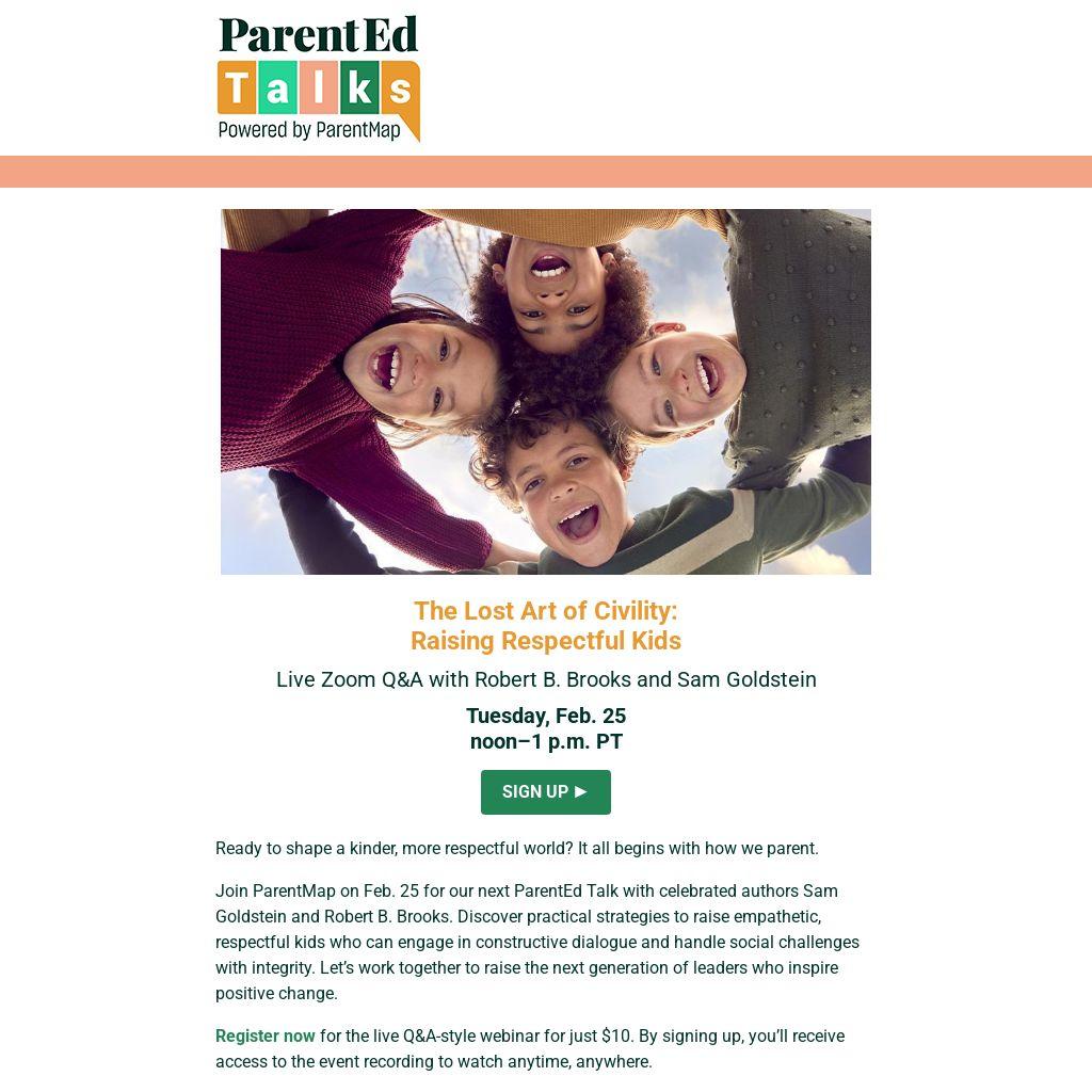 Join ParentMap on Feb. 25 for our next ParentEd Talk with celebrated authors Sam Goldstein and Robert B. Brooks. Discover practical strategies to raise empathetic, respectful kids who can engage in constructive dialogue and handle social challenges with integrity. Let’s work together to raise the next generation of leaders who inspire positive change.