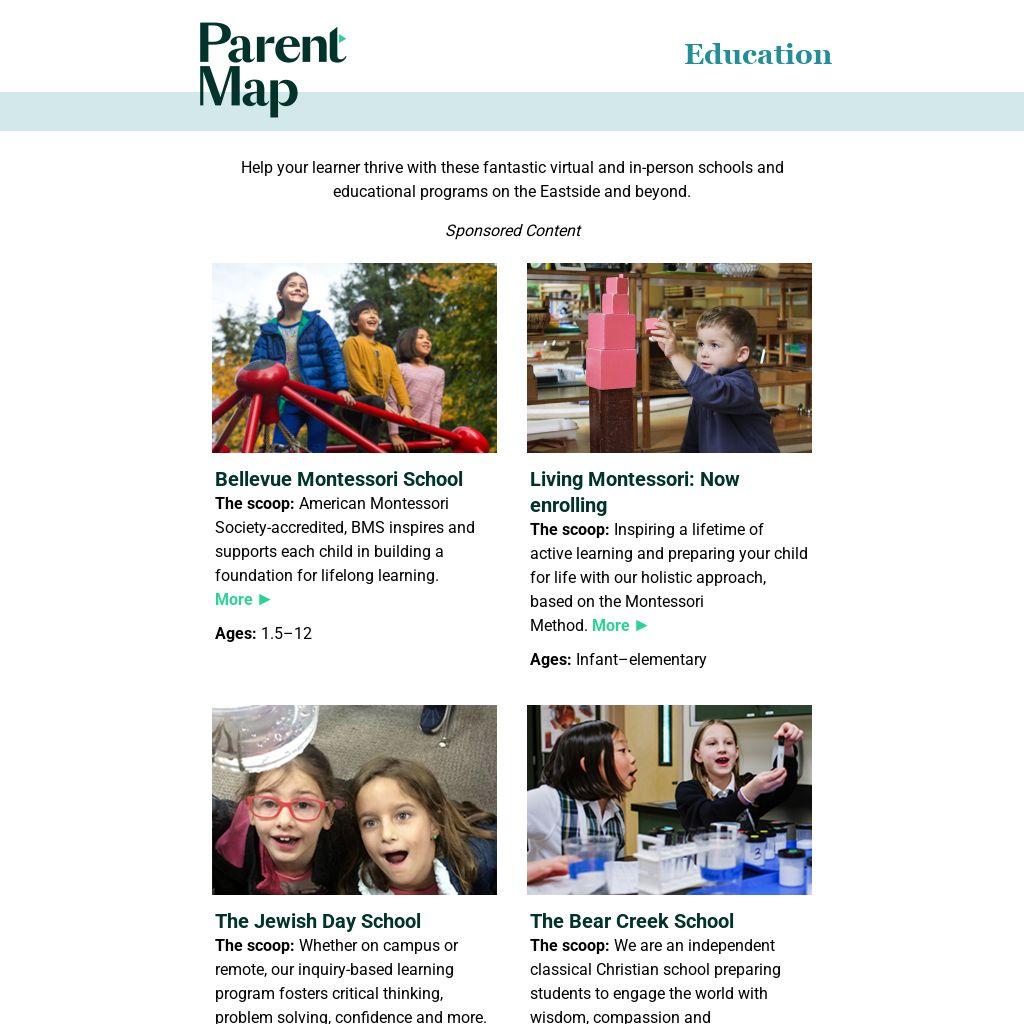 The scoop: Enrolling kids ages 3–12 for authentic Montessori reimagined. E-learning and in-person options available for ages 3–5 and e-learning options for grades K–6. More ►
