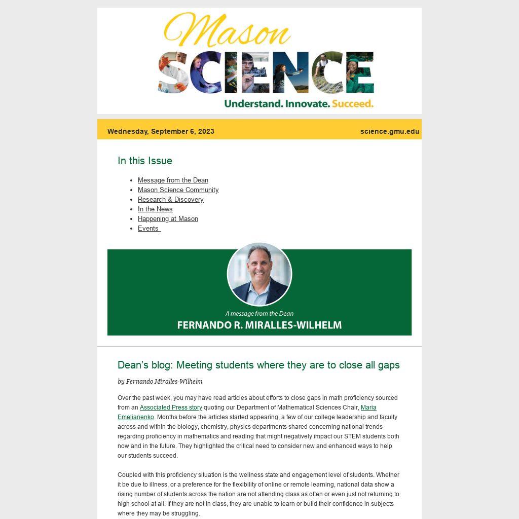 ScienceConnect 2023 September 12, 2023 | 12:30 to 4:30 p.m. | Fairfax Campus September 14, 2023 | 11:30 a.m. to 1:30 p.m. | SciTech Campus Encourage your students to attend. Meet Mason Science students while discussing your programs and sharing research and professional opportunities with free food and chances to win Mason Science SWAG. Register to attend.