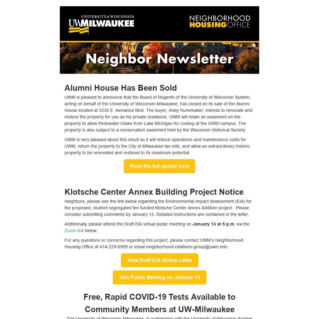 UWM is pleased to announce that the Board of Regents of the University of Wisconsin System, acting on behalf of the University of Wisconsin-Milwaukee, has closed on its sale of the Alumni House located at 3230 E. Kenwood Blvd. The buyer, Andy Nunemaker, intends to renovate and restore the property for use as his private residence. UWM will retain an easement on the property to allow freshwater intake from Lake Michigan for cooling at the UWM campus. The property is also subject to a conservation easement held by the Wisconsin Historical Society.