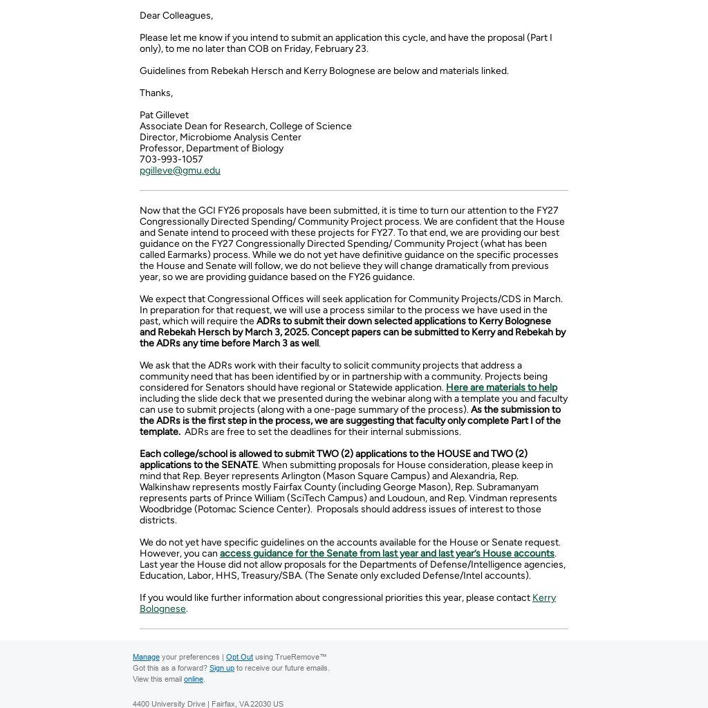 Each college/school is allowed to submit TWO (2) applications to the HOUSE and TWO (2) applications to the SENATE. When submitting proposals for House consideration, please keep in mind that Rep. Beyer represents Arlington (Mason Square Campus) and Alexandria, Rep. Walkinshaw represents mostly Fairfax County (including George Mason), Rep. Subramanyam represents parts of Prince William (SciTech Campus) and Loudoun, and Rep. Vindman represents Woodbridge (Potomac Science Center). Proposals should address issues of interest to those districts.