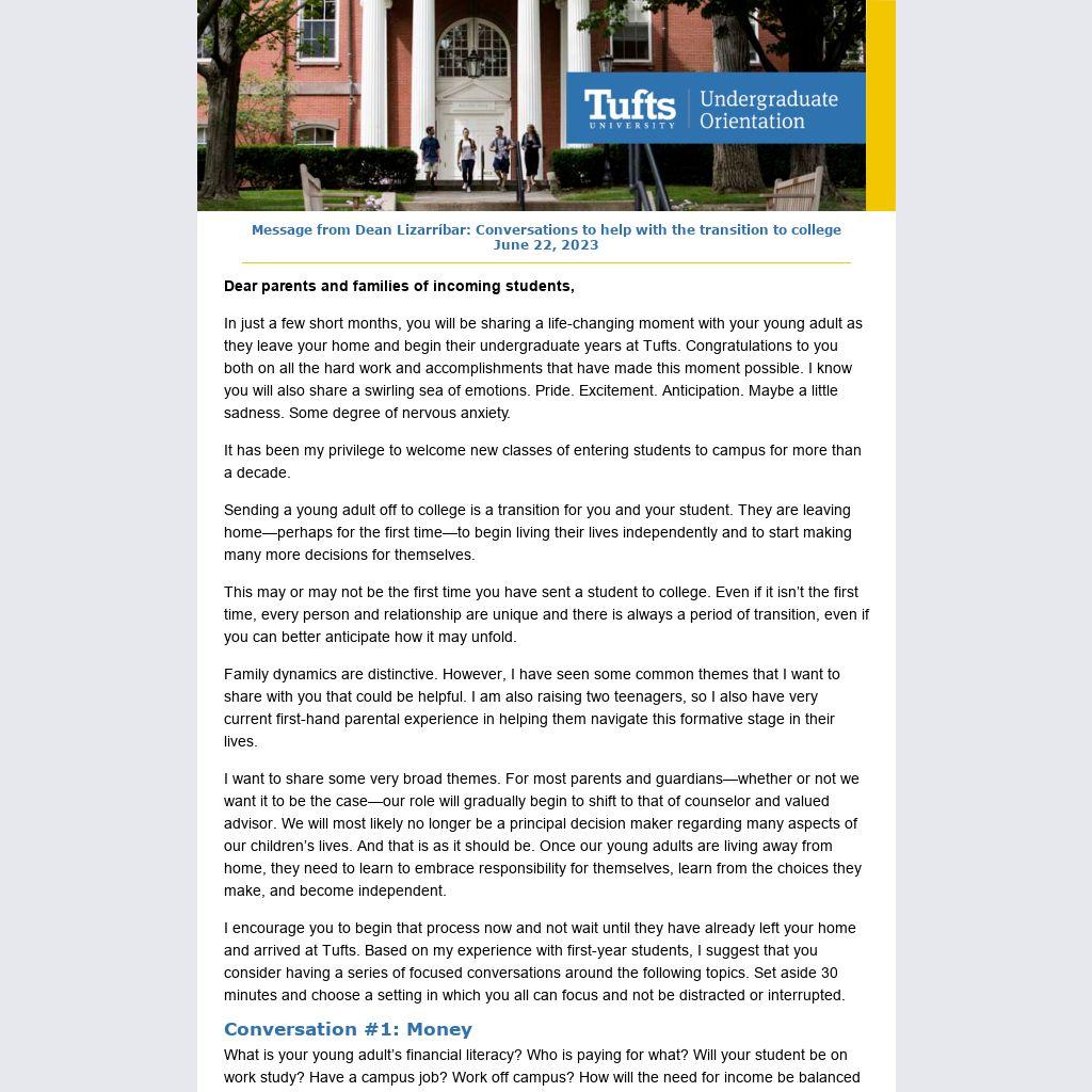I hope these suggestions are well received. They come from someone who has participated in this transition numerous times, but also from one parent to another: sharing what I know others have found helpful. I also recognize that every family and student are unique, so take only what may resonate with you. And as always, please be kind and generous with yourselves as you navigate this new phase in your relationship with your students. As Dean of Students, this work gives me great personal and professional satisfaction and joy. Along with all of us at Tufts, we are very much looking forward to meeting and supporting your young adult.