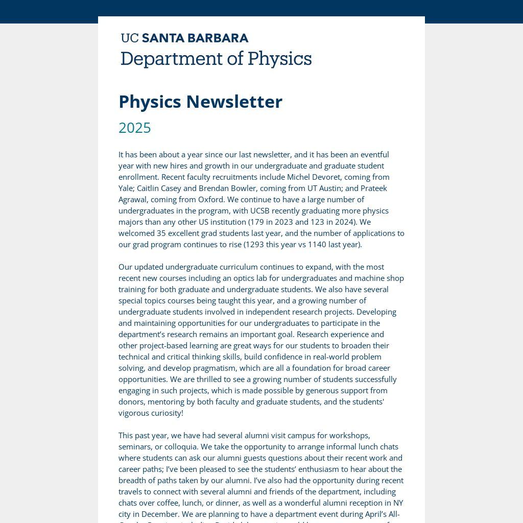 It has been about a year since our last newsletter, and it has been an eventful year with new hires and growth in our undergraduate and graduate student enrollment. Recent faculty recruitments include Michel Devoret, coming from Yale; Caitlin Casey and Brendan Bowler, coming from UT Austin; and Prateek Agrawal, coming from Oxford. We continue to have a large number of undergraduates in the program, with UCSB recently graduating more physics majors than any other US institution (179 in 2023 and 123 in 2024). We welcomed 35 excellent grad students last year, and the number of applications to our grad program continues to rise (1293 this year vs 1140 last year).