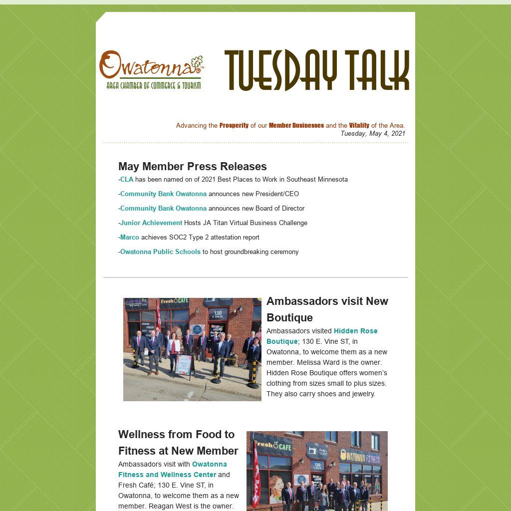 Ambassadors visit New BoutiqueAmbassadors visited Hidden Rose Boutique; 130 E. Vine ST, in Owatonna, to welcome them as a new member. Melissa Ward is the owner. Hidden Rose Boutique offers women’s clothing from sizes small to plus sizes. They also carry shoes and jewelry.