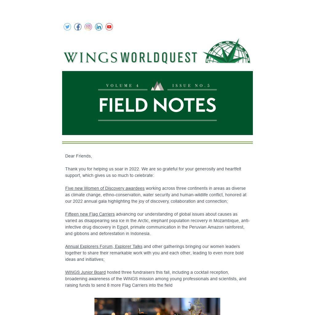 WINGS Junior Board hosted three fundraisers this fall, including a cocktail reception, broadening awareness of the WINGS mission among young professionals and scientists, and raising funds to send 8 more Flag Carriers into the field