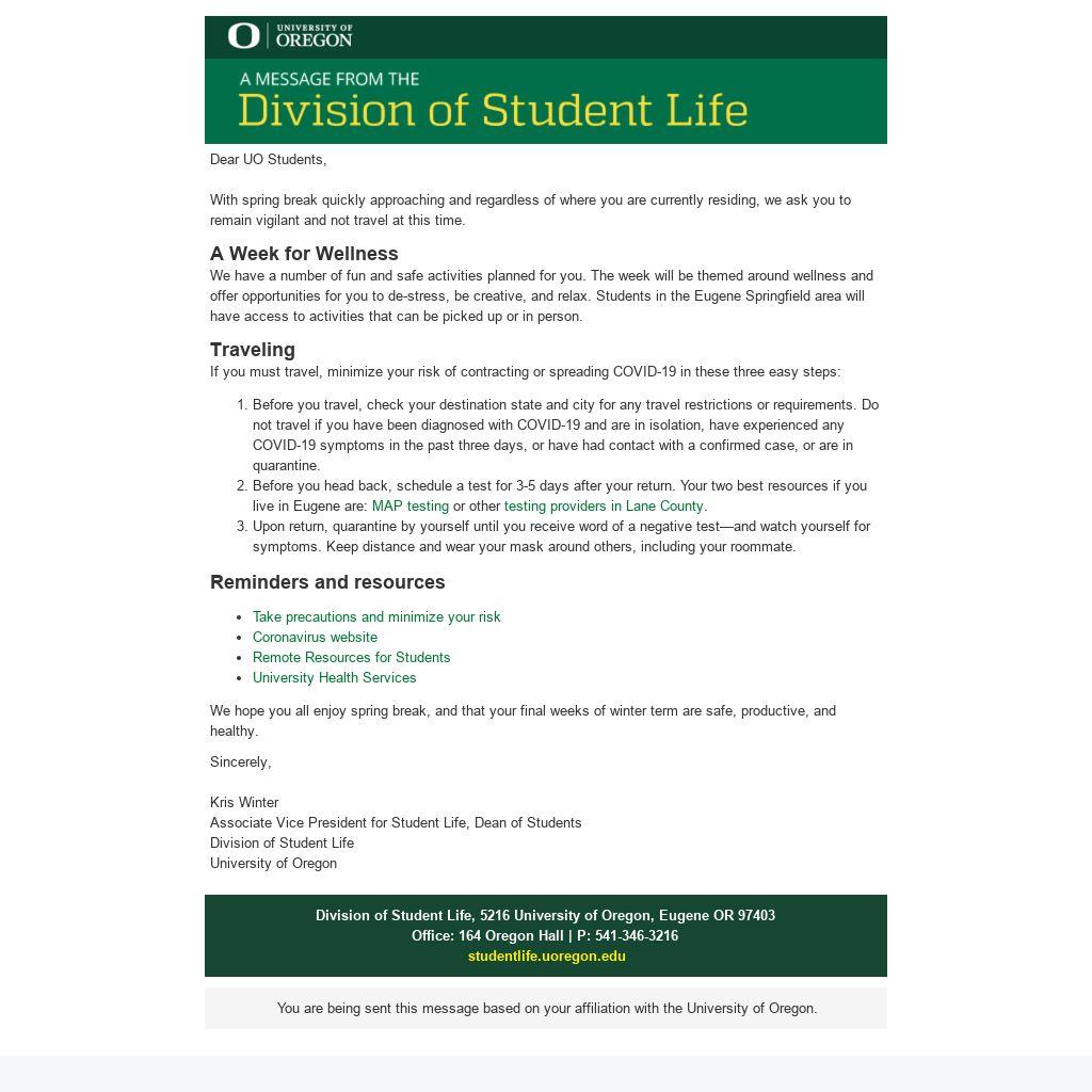 With spring break quickly approaching and regardless of where you are currently residing, we ask you to remain vigilant and not travel at this time.
