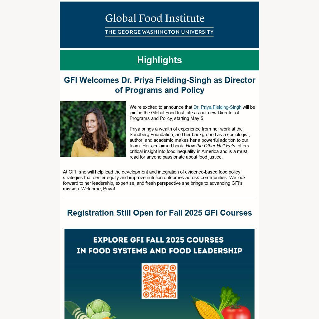 We’re excited to announce that Dr. Priya Fielding-Singh will be joining the Global Food Institute as our new Director of Programs and Policy, starting May 5.