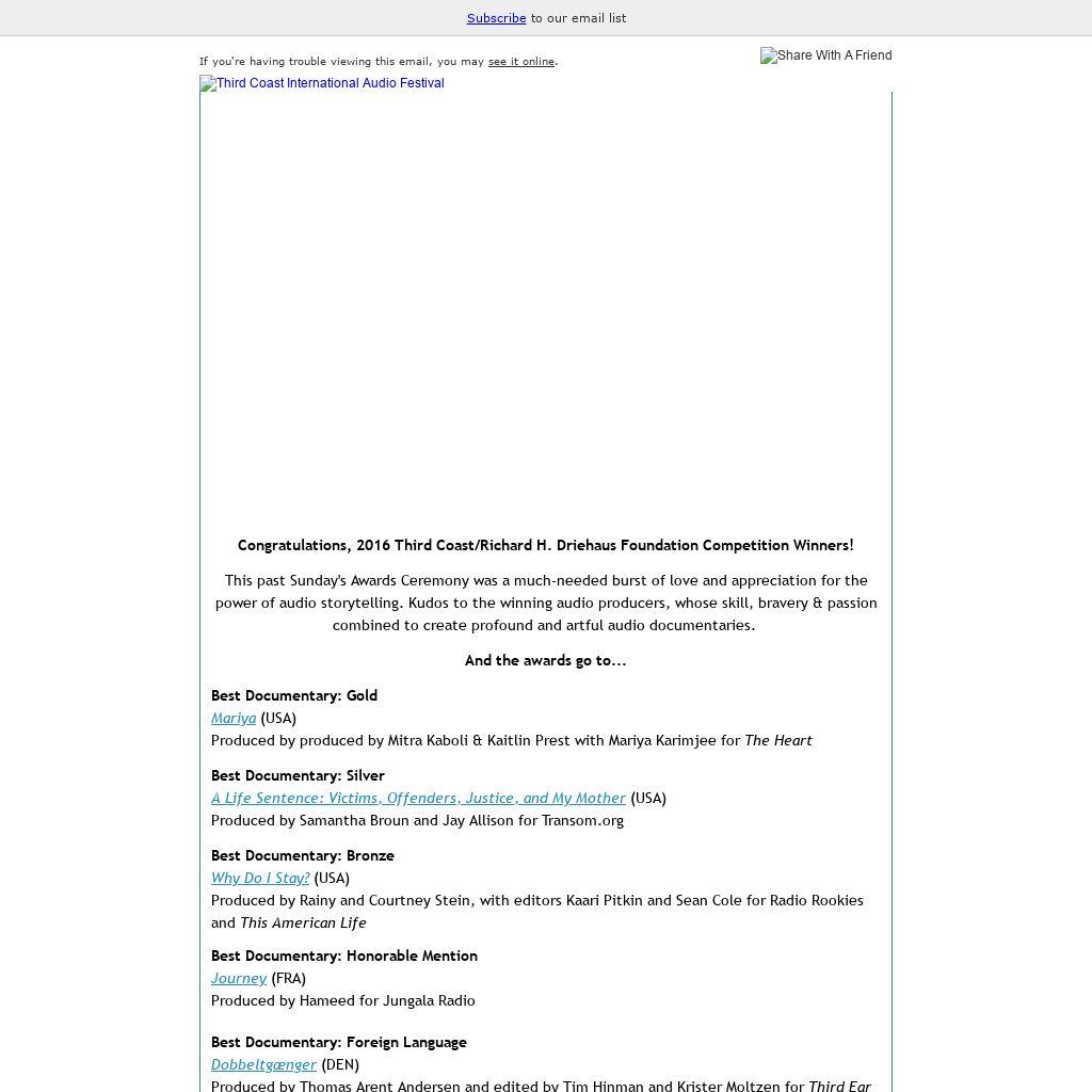 This past Sunday's Awards Ceremony was a much-needed burst of love and appreciation for the power of audio storytelling. Kudos to the winning audio producers, whose skill, bravery & passion combined to create profound and artful audio documentaries.