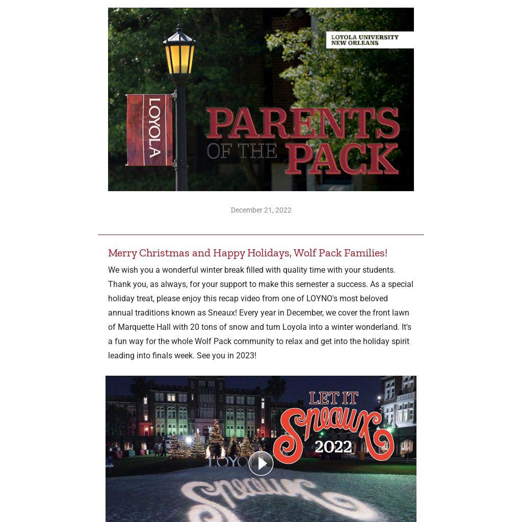 We wish you a wonderful winter break filled with quality time with your students. Thank you, as always, for your support to make this semester a success. As a special holiday treat, please enjoy this recap video from one of LOYNO's most beloved annual traditions known as Sneaux! Every year in December, we cover the front lawn of Marquette Hall with 20 tons of snow and turn Loyola into a winter wonderland. It's a fun way for the whole Wolf Pack community to relax and get into the holiday spirit leading into finals week. See you in 2023!