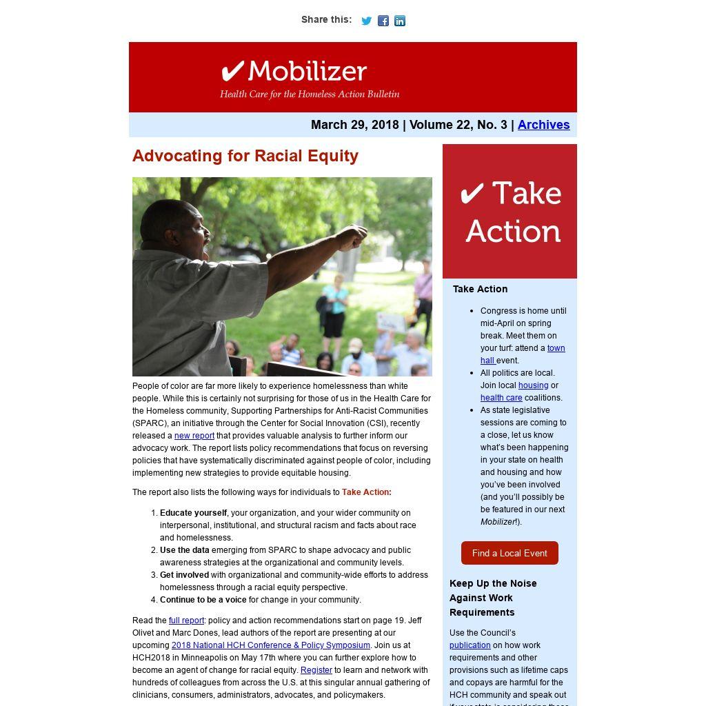 - As state legislative sessions are coming to a close, let us know what’s been happening in your state on health and housing and how you’ve been involved (and you’ll possibly be be featured in our next Mobilizer!).