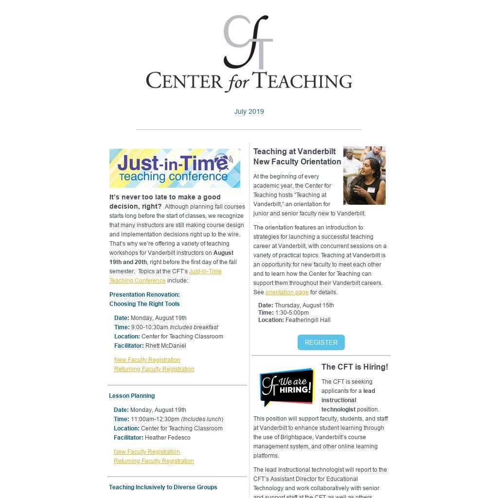 | It’s never too late to make a good decision, right? Although planning fall courses starts long before the start of classes, we recognize that many instructors are still making course design and implementation decisions right up to the wire. That’s why we’re offering a variety of teaching workshops for Vanderbilt instructors on August 19th and 20th, right before the first day of the fall semester. Topics at the CFT’s Just-in-Time Teaching Conference include: