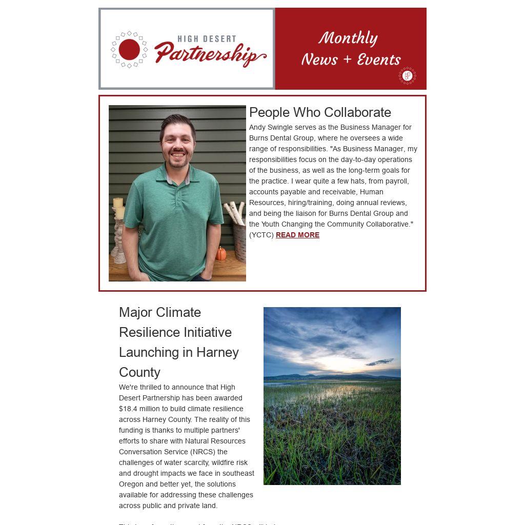 Major Climate Resilience Initiative Launching in Harney CountyWe're thrilled to announce that High Desert Partnership has been awarded $18.4 million to build climate resilience across Harney County. The reality of this funding is thanks to multiple partners' efforts to share with Natural Resources Conversation Service (NRCS) the challenges of water scarcity, wildfire risk and drought impacts we face in southeast Oregon and better yet, the solutions available for addressing these challenges across public and private land.