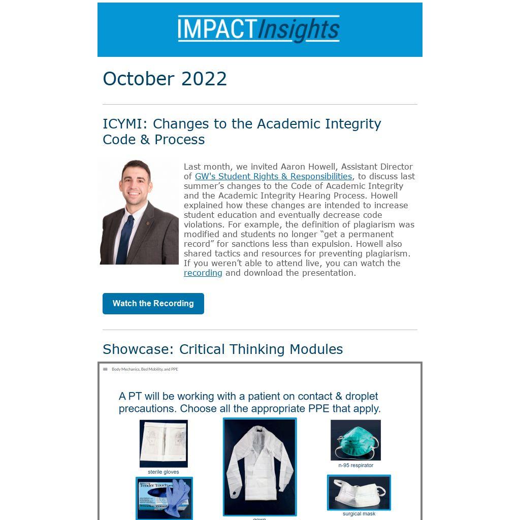 Last month, we invited Aaron Howell, Assistant Director of GW's Student Rights & Responsibilities, to discuss last summer’s changes to the Code of Academic Integrity and the Academic Integrity Hearing Process. Howell explained how these changes are intended to increase student education and eventually decrease code violations. For example, the definition of plagiarism was modified and students no longer “get a permanent record” for sanctions less than expulsion. Howell also shared tactics and resources for preventing plagiarism. If you weren’t able to attend live, you can watch the recording and download the presentation.