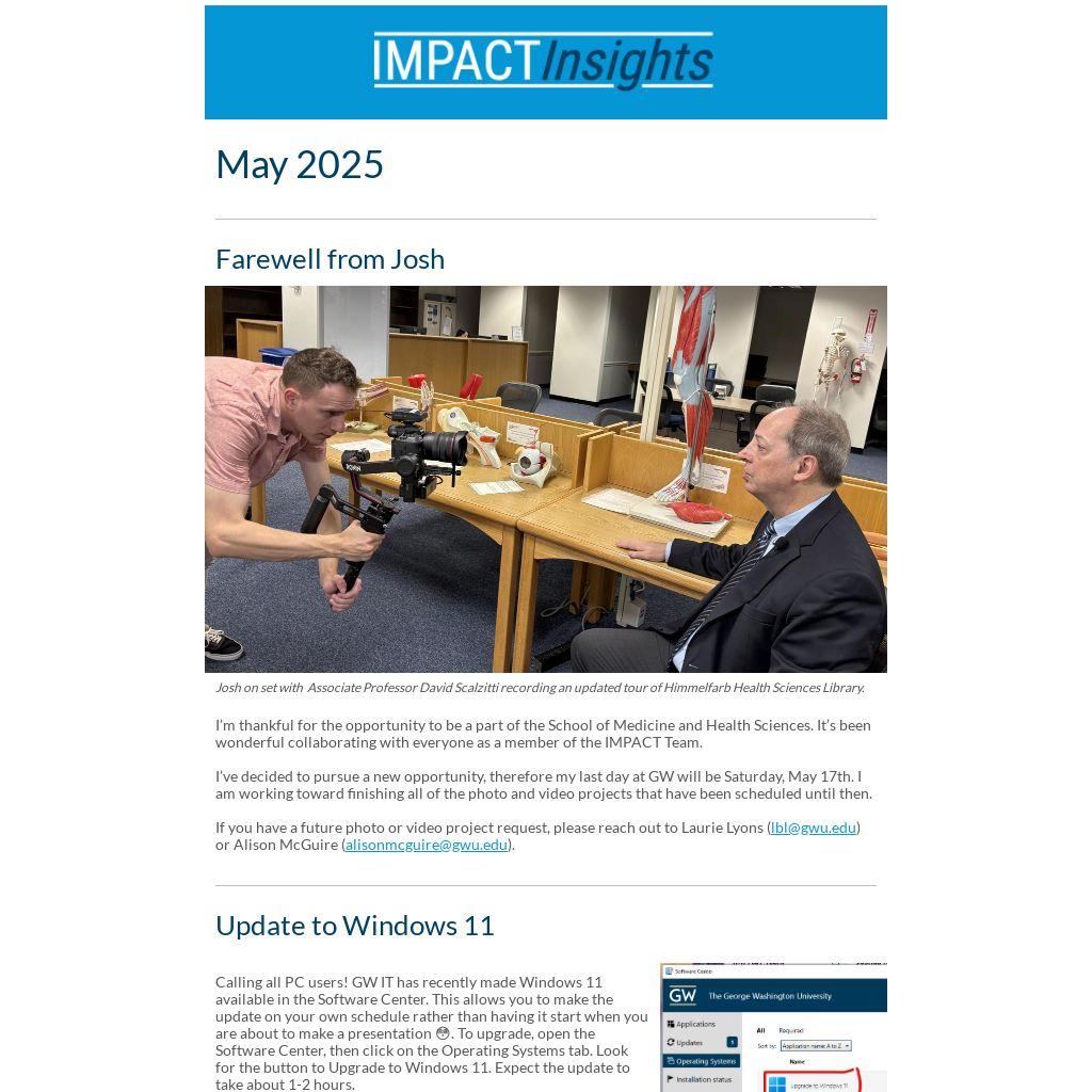 Calling all PC users! GW IT has recently made Windows 11 available in the Software Center. This allows you to make the update on your own schedule rather than having it start when you are about to make a presentation 😳. To upgrade, open the Software Center, then click on the Operating Systems tab. Look for the button to Upgrade to Windows 11. Expect the update to take about 1-2 hours.Â