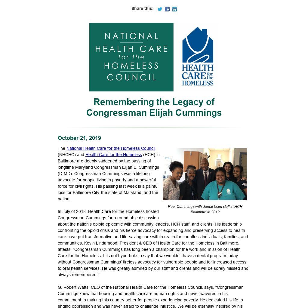 The National Health Care for the Homeless Council (NHCHC) and Health Care for the Homeless (HCH) in Baltimore are deeply saddened by the passing of longtime Maryland Congressman Elijah E. Cummings (D-MD). Congressman Cummings was a lifelong advocate for people living in poverty and a powerful force for civil rights. His passing last week is a painful loss for Baltimore City, the state of Maryland, and the nation.