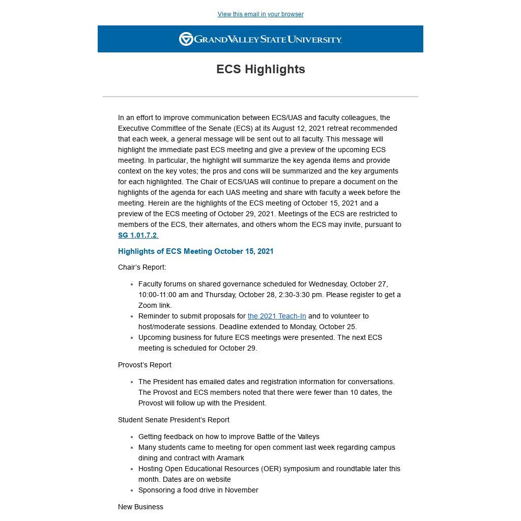 In an effort to improve communication between ECS/UAS and faculty colleagues, the Executive Committee of the Senate (ECS) at its August 12, 2021 retreat recommended that each week, a general message will be sent out to all faculty. This message will highlight the immediate past ECS meeting and give a preview of the upcoming ECS meeting. In particular, the highlight will summarize the key agenda items and provide context on the key votes; the pros and cons will be summarized and the key arguments for each highlighted. The Chair of ECS/UAS will continue to prepare a document on the highlights of the agenda for each UAS meeting and share with faculty a week before the meeting. Herein are the highlights of the ECS meeting of October 15, 2021 and a preview of the ECS meeting of October 29, 2021. Meetings of the ECS are restricted to members of the ECS, their alternates, and others whom the ECS may invite, pursuant to SG 1.01.7.2.