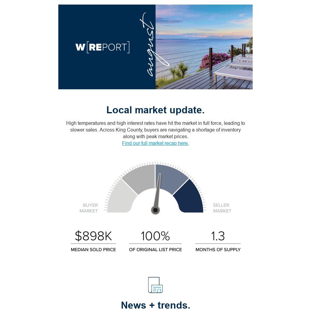 High temperatures and high interest rates have hit the market in full force, leading to slower sales. Across King County, buyers are navigating a shortage of inventory along with peak market prices. Find our full market recap here.
