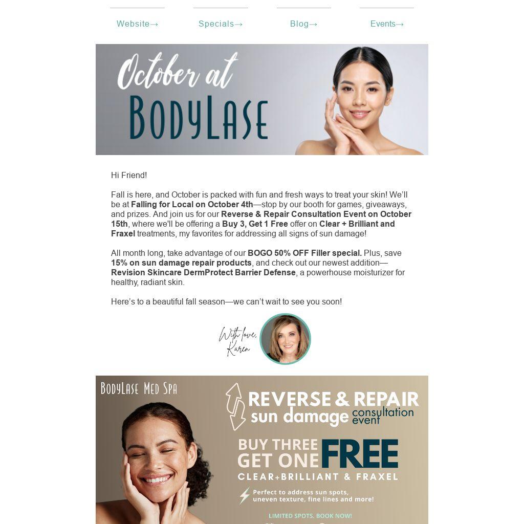 Fall is here, and October is packed with fun and fresh ways to treat your skin! We’ll be at Falling for Local on October 4th—stop by our booth for games, giveaways, and prizes. And join us for our Reverse & Repair Consultation Event on October 15th, where we'll be offering a Buy 3, Get 1 Free offer on Clear + Brilliant and Fraxel treatments, my favorites for addressing all signs of sun damage!