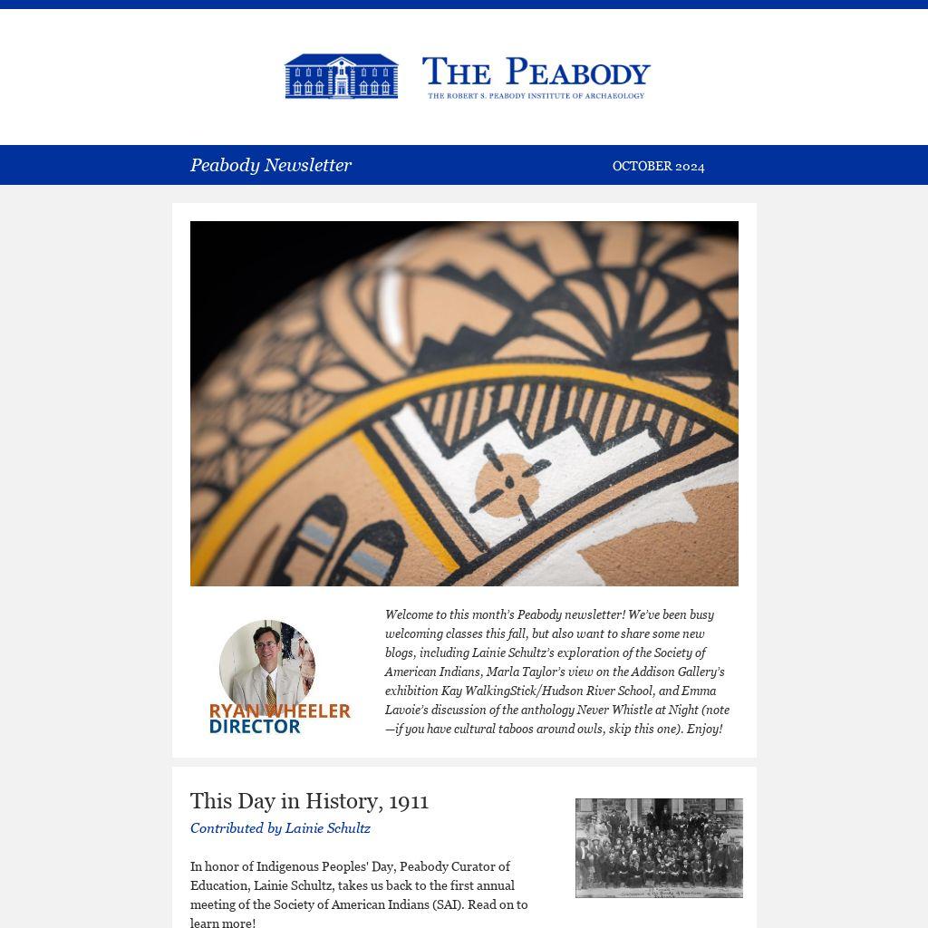 Welcome to this month’s Peabody newsletter! We’ve been busy welcoming classes this fall, but also want to share some new blogs, including Lainie Schultz’s exploration of the Society of American Indians, Marla Taylor’s view on the Addison Gallery’s exhibition Kay WalkingStick/Hudson River School, and Emma Lavoie’s discussion of the anthology Never Whistle at Night (note—if you have cultural taboos around owls, skip this one). Enjoy!