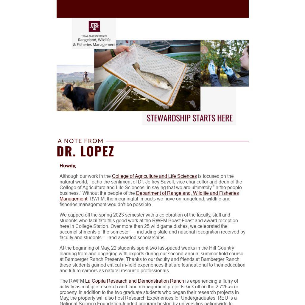 Although our work in the College of Agriculture and Life Sciences is focused on the natural world, I echo the sentiment of Dr. Jeffrey Savell, vice chancellor and dean of the College of Agriculture and Life Sciences, in saying that we are ultimately “in the people business.” Without the people of the Department of Rangeland, Wildlife and Fisheries Management, RWFM, the meaningful impacts we have on rangeland, wildlife and fisheries management wouldn’t be possible.