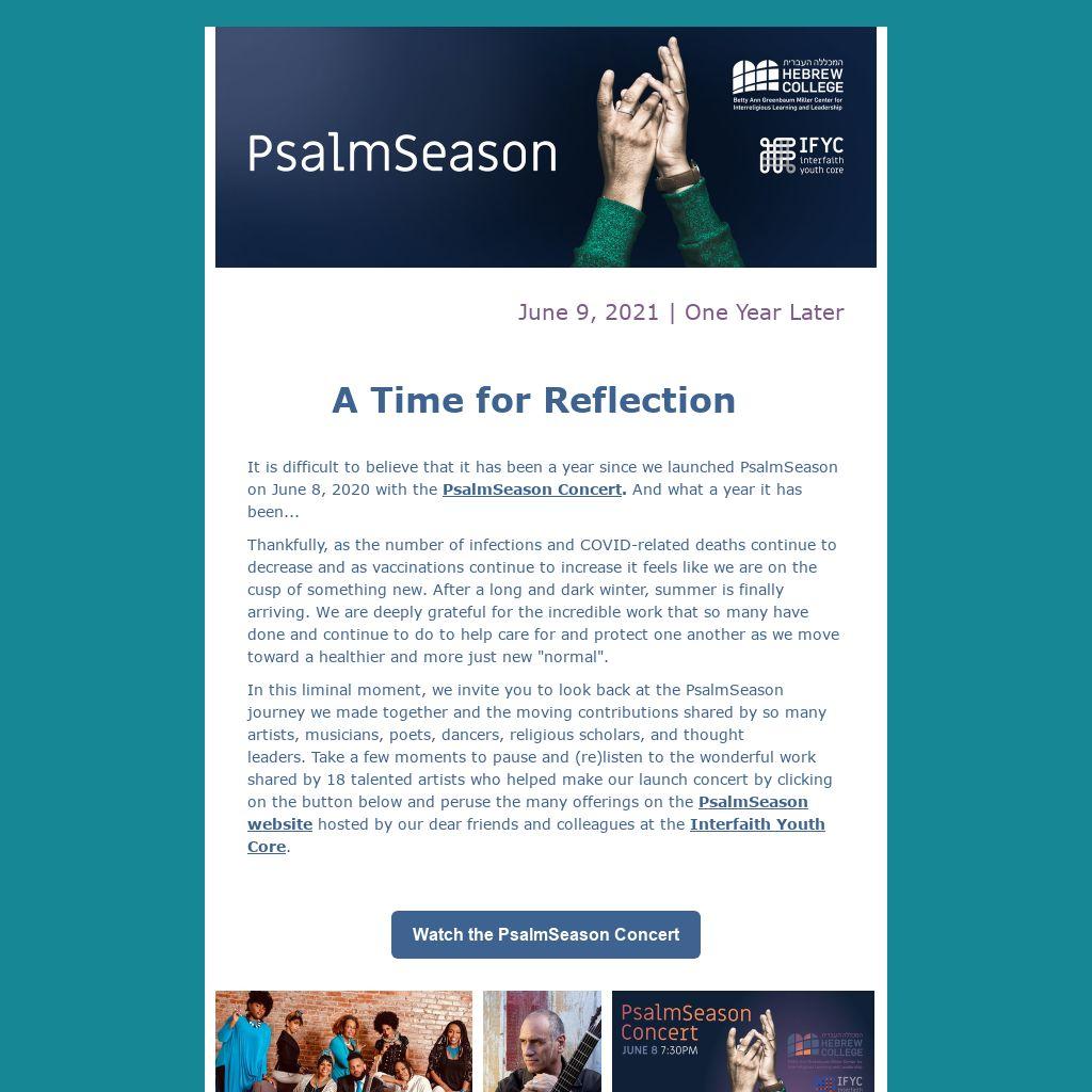 We are excited to announce that there will be more opportunities to engage with PsalmSeason in the future! We are working on a published collection of PsalmSeason content to be published by Paraclete Press in 2022. We have also recently received a generous grant from the United States Conference of Catholic Bishops to develop a multi-media curriculum that builds upon the work of PsalmSeason and the joint course that Dr. Andrew Davis (Boston College) and Rabbi Or Rose (Hebrew College) have cotaught for local theological and graduate students for several years now.