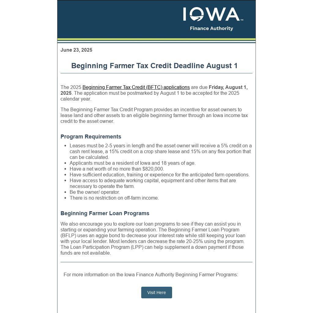 The 2025 Beginning Farmer Tax Credit (BFTC) applications are due Friday, August 1, 2025. The application must be postmarked by August 1 to be accepted for the 2025 calendar year.