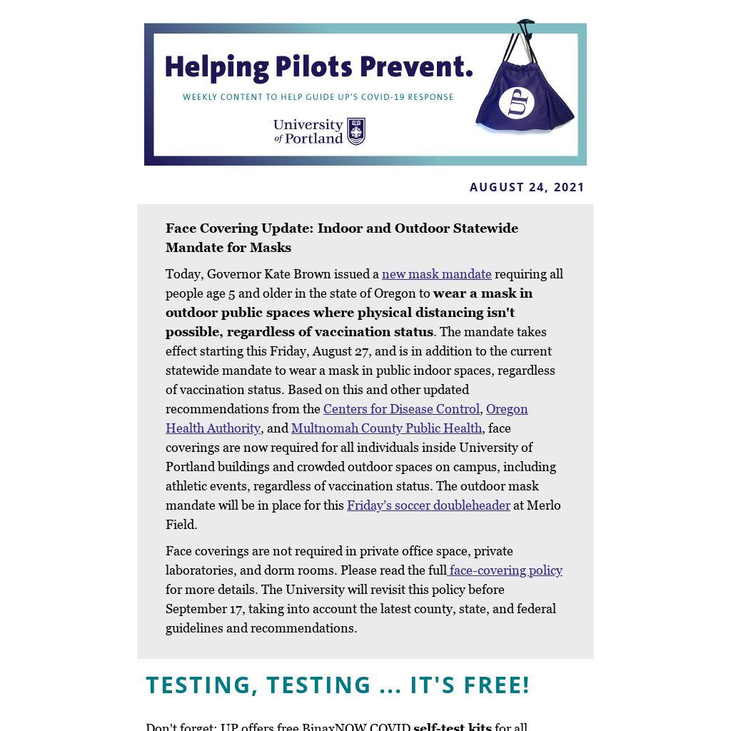 Today, Governor Kate Brown issued a new mask mandate requiring all people age 5 and older in the state of Oregon to wear a mask in outdoor public spaces where physical distancing isn't possible, regardless of vaccination status. The mandate takes effect starting this Friday, August 27, and is in addition to the current statewide mandate to wear a mask in public indoor spaces, regardless of vaccination status. Based on this and other updated recommendations from the Centers for Disease Control, Oregon Health Authority, and Multnomah County Public Health, face coverings are now required for all individuals inside University of Portland buildings and crowded outdoor spaces on campus, including athletic events, regardless of vaccination status. The outdoor mask mandate will be in place for this Friday’s soccer doubleheader at Merlo Field.