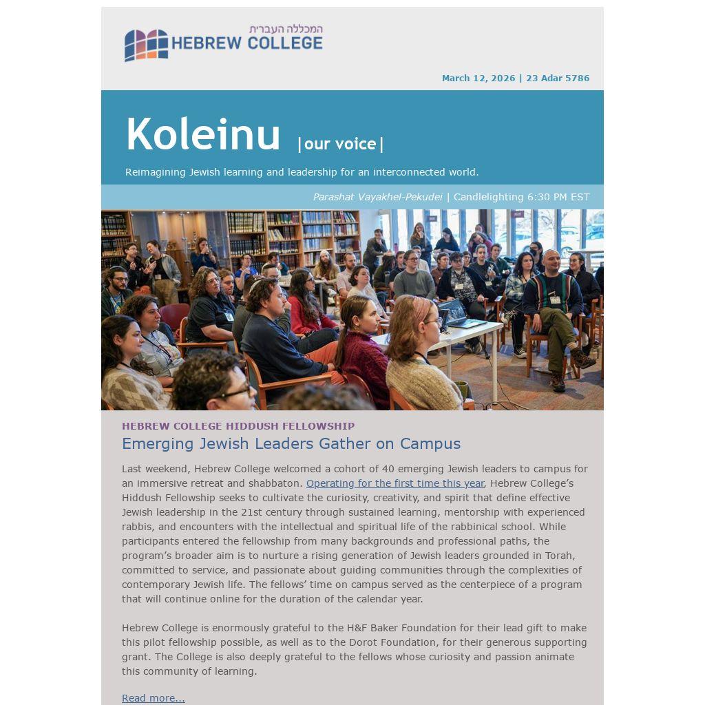 Last weekend, Hebrew College welcomed a cohort of 40 emerging Jewish leaders to campus for an immersive retreat and shabbaton. Operating for the first time this year, Hebrew College’s Hiddush Fellowship seeks to cultivate the curiosity, creativity, and spirit that define effective Jewish leadership in the 21st century through sustained learning, mentorship with experienced rabbis, and encounters with the intellectual and spiritual life of the rabbinical school. While participants entered the fellowship from many backgrounds and professional paths, the program’s broader aim is to nurture a rising generation of Jewish leaders grounded in Torah, committed to service, and passionate about guiding communities through the complexities of contemporary Jewish life. The fellows’ time on campus served as the centerpiece of a program that will continue online for the duration of the calendar year.