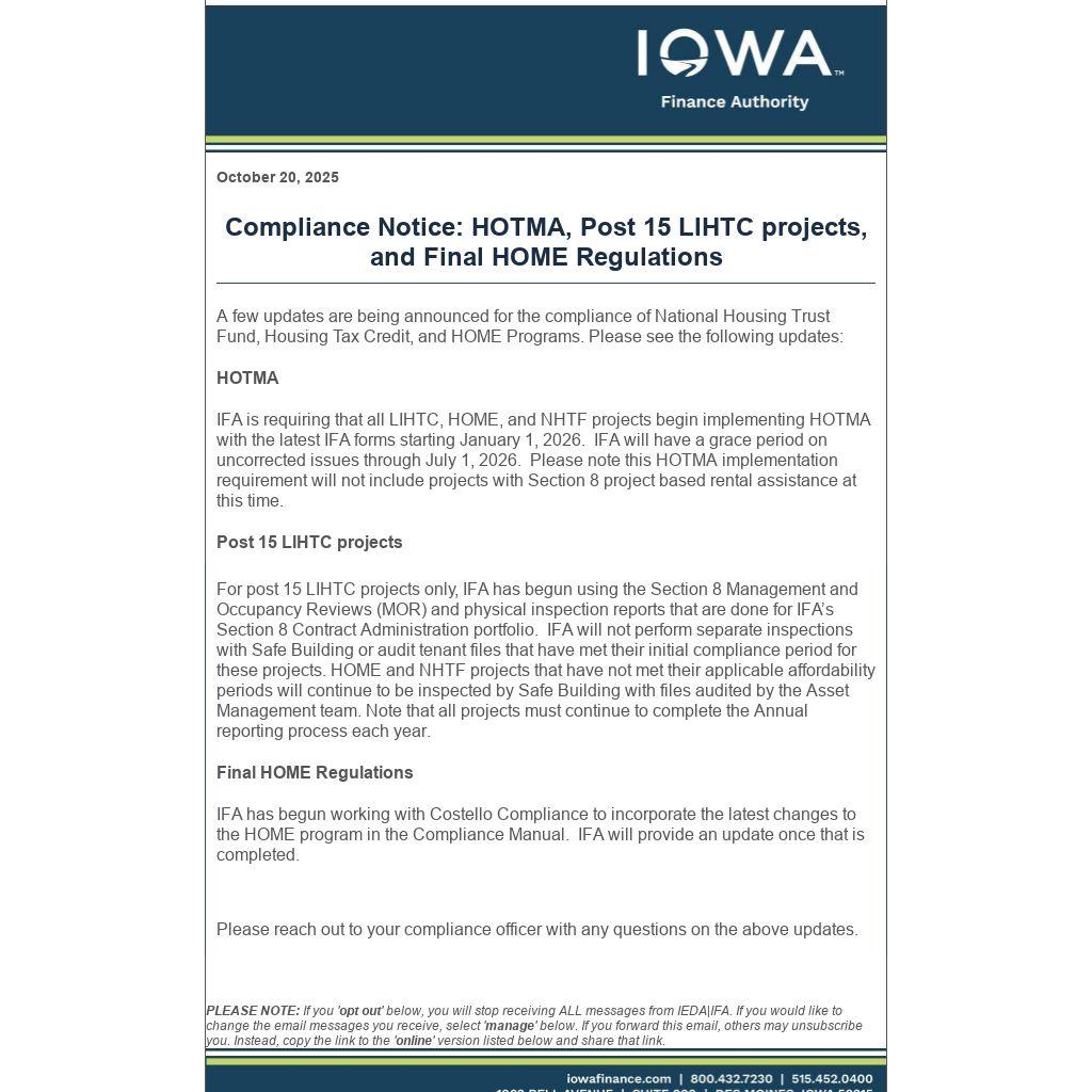 IFA has begun working with Costello Compliance to incorporate the latest changes to the HOME program in the Compliance Manual. IFA will provide an update once that is completed.