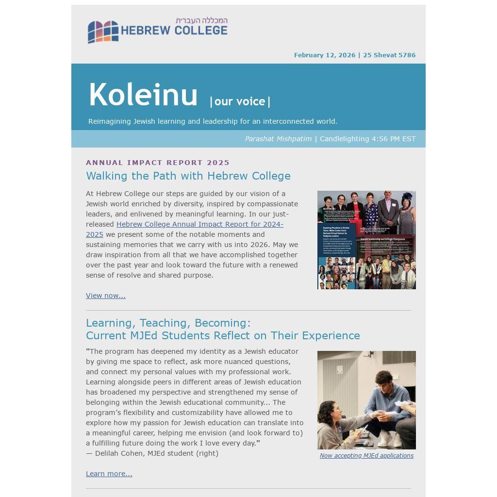 At Hebrew College our steps are guided by our vision of a Jewish world enriched by diversity, inspired by compassionate leaders, and enlivened by meaningful learning. In our just-released Hebrew College Annual Impact Report for 2024-2025 we present some of the notable moments and sustaining memories that we carry with us into 2026. May we draw inspiration from all that we have accomplished together over the past year and look toward the future with a renewed sense of resolve and shared purpose.