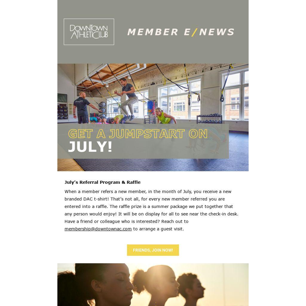 When a member refers a new member, in the month of July, you receive a new branded DAC t-shirt! Thatās not all, for every new member referred you are entered into a raffle. The raffle prize is a summer package we put together that any person would enjoy! It will be on display for all to see near the check-in desk. Have a friend or colleague who is interested? Reach out to membership@downtownac.comĀ to arrange a guest visit.