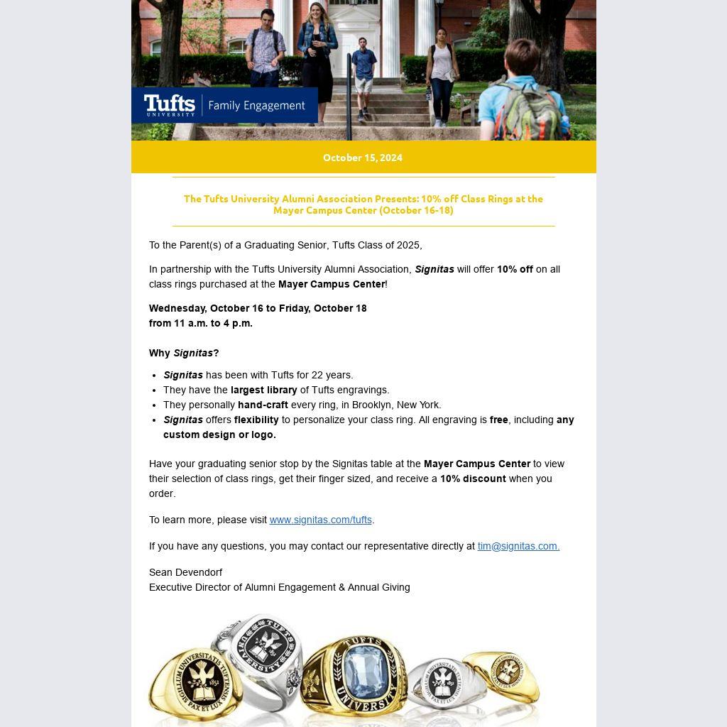 In partnership with the Tufts University Alumni Association, Signitas will offer 10% off on all class rings purchased at the Mayer Campus Center!