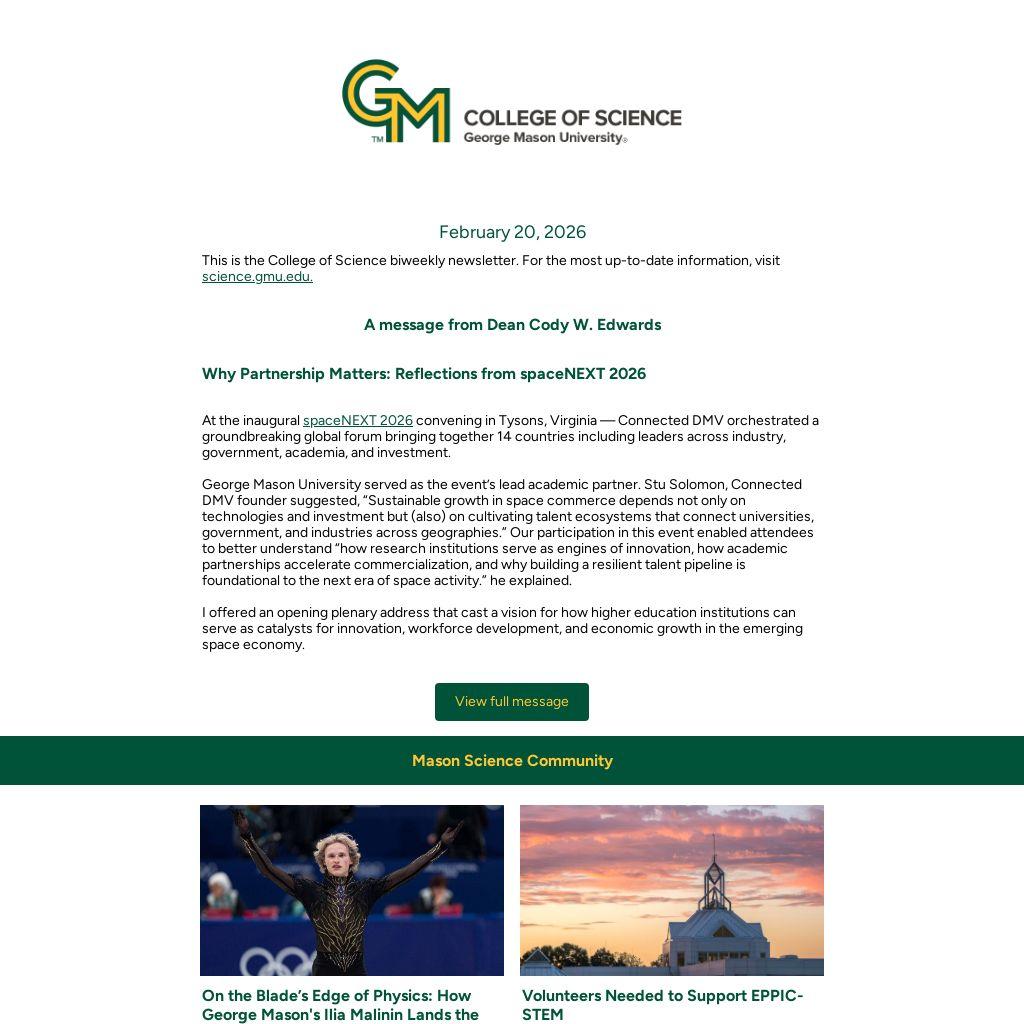 This is the College of Science biweekly newsletter. For the most up-to-date information, visit science.gmu.edu.